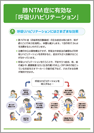 肺NTM症の治療は薬物療法が中心ですが、呼吸法や排痰法などの呼吸リハビリテーションを併用すると、症状の改善につながることがわかっています。そこで、患者さんに呼吸リハビリテーションの重要性をご理解いただくための患者説明用のパンフレットを作成いたしました。呼吸リハビリテーションの具体的な方法をわかりやすく解説しておりますので患者さんへの説明の際にお役立てください。